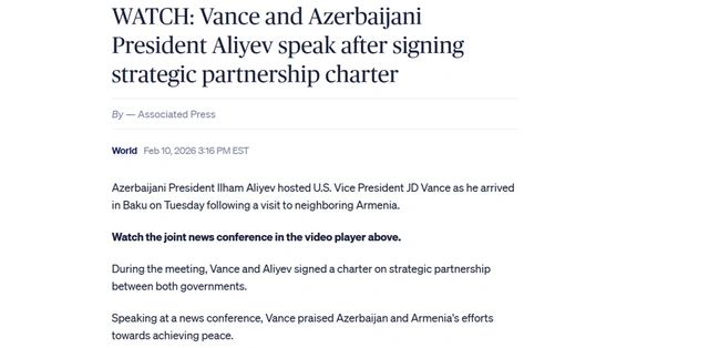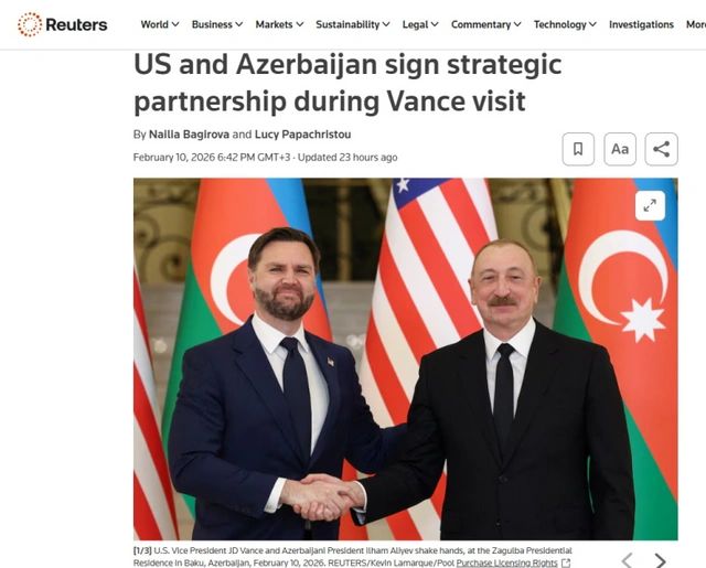 Bununla yanaşı, "Reuters"də dərc olunmuş "ABŞ və Azərbaycan Vensin səfəri çərçivəsində strateji tərəfdaşlıq müqaviləsi imzalayıblar" sərlövhəli yazıda qeyd olunur ki, Azərbaycan Prezidenti İlham Əliyev mətbuata birgə bəyanat zamanı ABŞ və Azərbaycan arasında münasibətlərin bu gün tamamilə yeni mərhələyə qədəm qoyduğunu deyib. Yazıya əsasən, Vens bildirib ki, ABŞ Azərbaycana ərazi sularını qorumaq üçün gəmilər göndərəcək. Vurğulanır ki, Xartiya ilk dəfə avqust ayında Vaşinqtonda Prezident İlham Əliyevlə Prezident Donald Tramp arasında danışıqlarda təqdim olunub.
