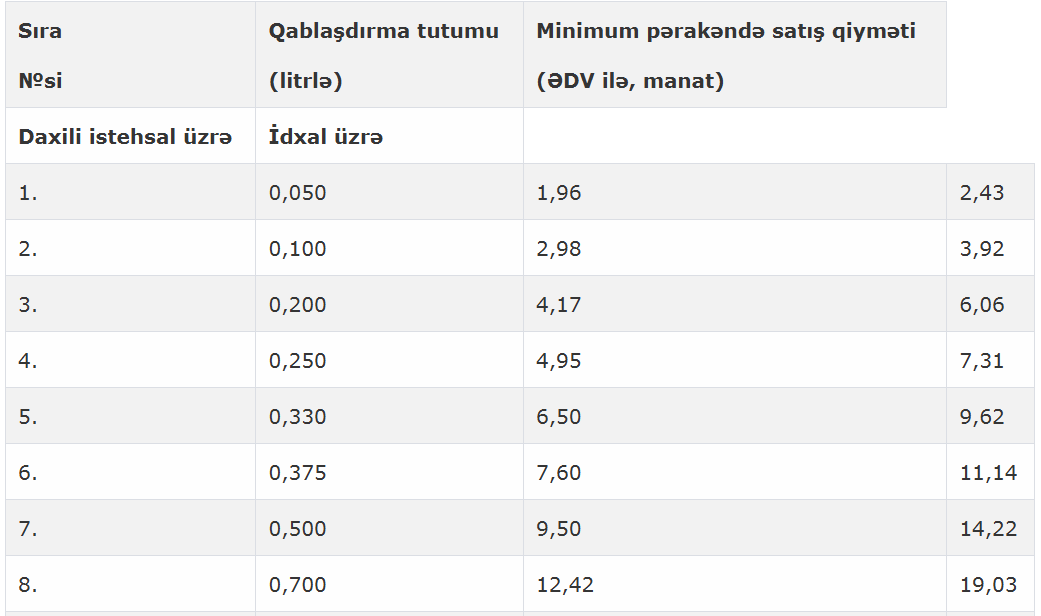 Qəbul edilən qərarla alkoqollu içkilərin pərakəndə satışına dair minimum qiymət aşağıdakı kimidir: