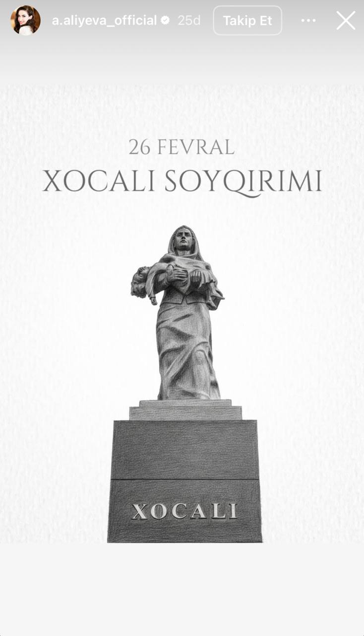 Prezident İlham Əliyevin gəlini Alena Əliyeva Xocalı soyqırımının 34-cü ildönümü ilə bağlı paylaşım edib.