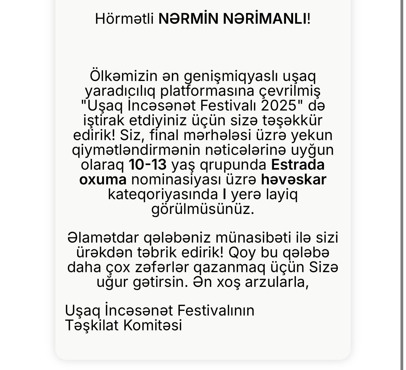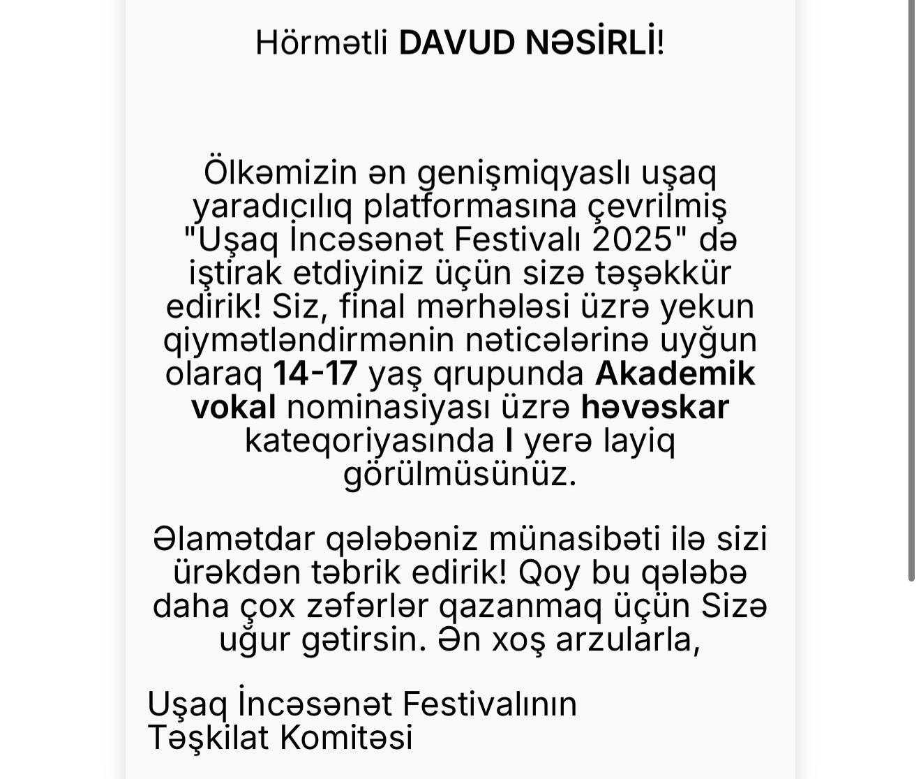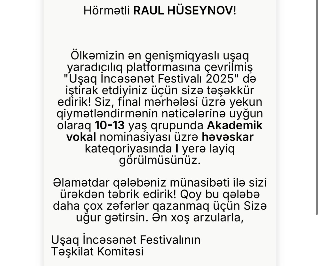 Heydər Əliyev Fondu tərəfindən həyata keçirilən "Uşaq İncəsənət Festivalı 2025” baş tutub. SİA xəbər verir ki, festivalın yekun qiymətləndirmə nəticələrinə uyğun olaraq Nərmin Nərimanlı, Davud Nəsirli və Raul Hüseynov yaş qrupuna uyğun olaraq akademik vokal nominasiyası üzrə birinci yerə layiq görülüblər.
