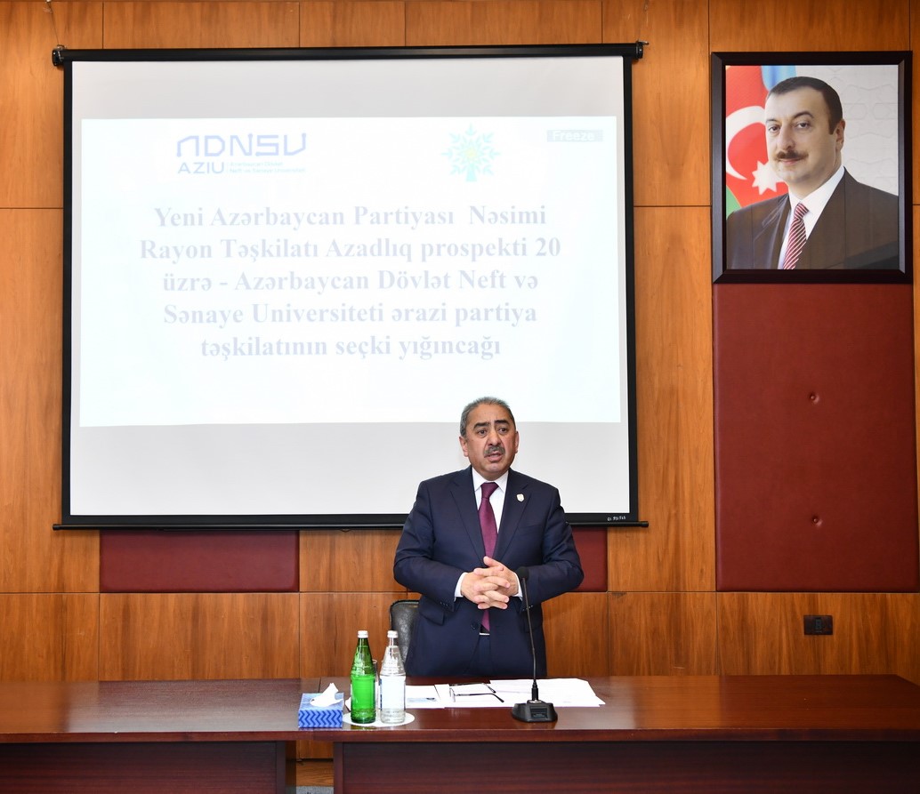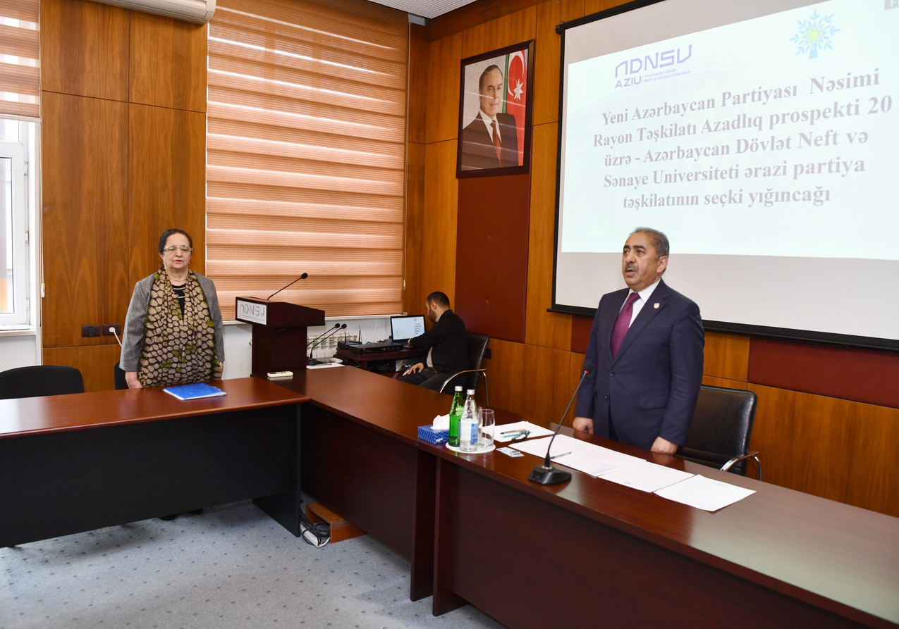 Fevralın 24-də Azərbaycan Dövlət Neft və Sənaye Universitetində (ADNSU) YAP Nəsimi Rayon Təşkilatının Azadlıq prospekti 20 ünvanı üzrə – Azərbaycan Dövlət Neft və Sənaye Universiteti ərazi partiya təşkilatının hesabat-seçki yığıncağı keçirilib.