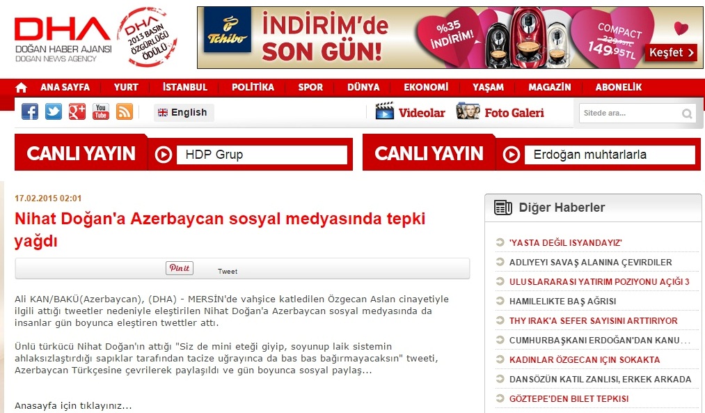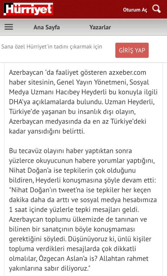 Baş redaktor deyib ki, türkiyəli müğənni Nihat Doğanın qardaş ölkədə baş verən və ölkənin gündəm mövzusu olan 20 yaşlı Özgecan Aslanın öldürülməsinə qeyri-insani reaksiyası Azərbaycanda da narazılıq doğurub: "Bu açıqlama qardaş Türkiyədə olduğu kimi Azərbaycanda da birmənalı qarşılanmadı və bu xəbərə 1 saat ərzində yüzlərlə şərh gəldi, həmyerlilərimiz türkiyəli qardaşlarımızın yanında olduğunu yazdılar. Türkiyədə baş verən bütün hadisələr kimi bu dəhşətli cinayət də ölkəmizdə həssas qarşılandı".
