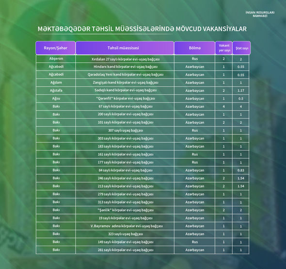Bağçalarda tərbiyəçi-müəllim vəzifəsi üzrə vakant yerlərin siyahısı açıqlandı