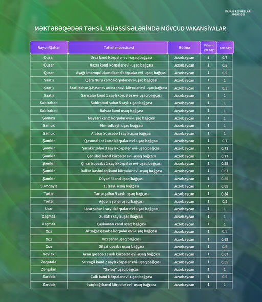 Məktəbəqədər təhsil müəssisələrində mövcud olan tərbiyəçi-müəllim vəzifəsi üzrə vakant yerlərin siyahısı açıqlanıb.