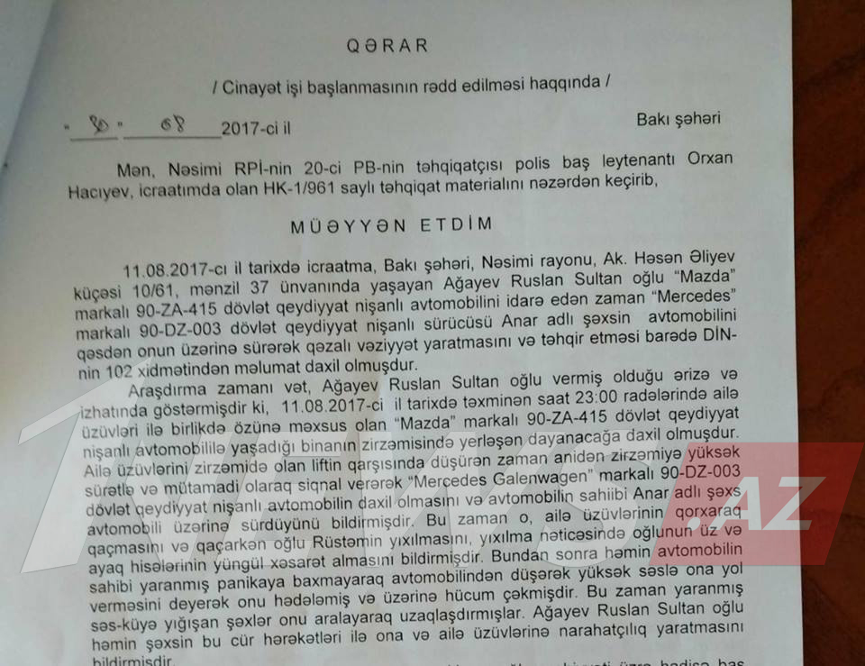 "Anar Mehdiyev ailənin yeganə oğlu olduğu üçün düşünür ki, o hər şey edə bilər, ona hər şey etməyə icazə verilib. İşləmir, bütün günü küçədədir, içir, qeyri-adekvat və aqressiv xarakterli insandır. Anası dövlət doğum evində ginekoloq, atası isə əvvəllər məmur olub, hazırda isə təqaüdçüdür. Anarın 3 maşını var. Qardaşım maşın saxladığı yerdə 2 qarajı da var. Üçüncü maşınını saxlaması üçün parklanma yeri də var. Lakin Anar gələn kimi Fərhadı sıxışdırmağa çalışırdı. Açıq surətdə qardaşıma deyirdi ki, ona məhz həmin yer lazımdır. Ona Mercedes-Benz Gelandewagen (90-DZ-003 dövlət nömrə nişanlı) alıblar və o, açıq surətdə qardaşımı yerindən sıxışdırmağa çalışırdı.