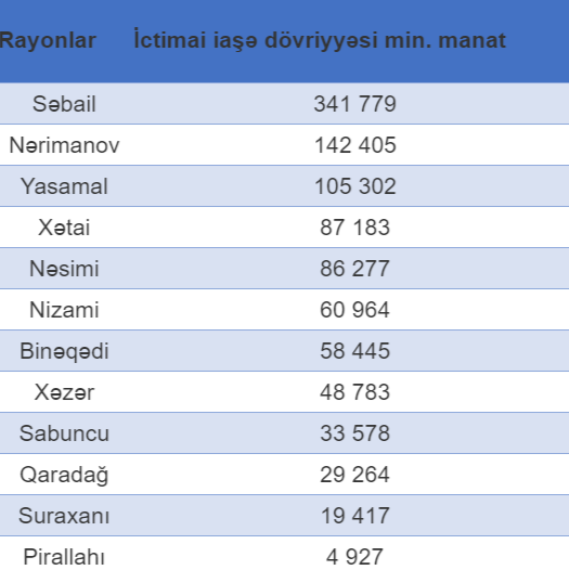 Paytaxtın ictimai iaşə dövriyyəsinin ən çox olduğu rayon Səbail ( 341 mln. 779 min manat), ən az olduğu rayon isə Pirallahıdır ( 4 927).//apa