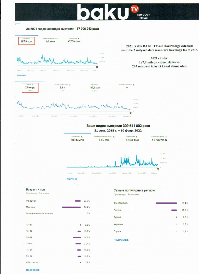 2021-ci ildə BAKU TV-nin hazırladığı videoları YouTube 2 milyard dəfə insanlara baxmağı təklif edib.