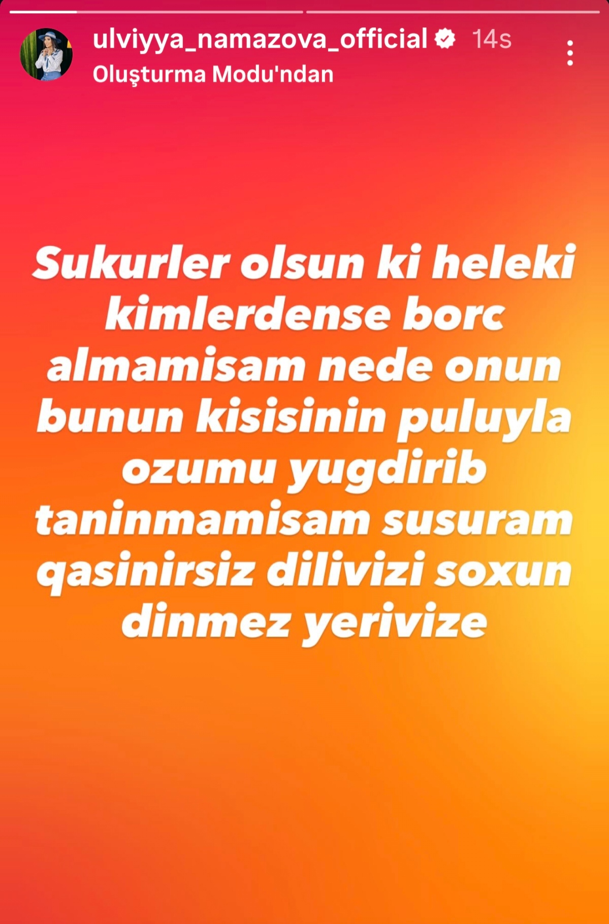 "Şükürlər olsun ki, hələlik kimsədən borc almamışam, nə də başqasının ərinin pulu ilə özümü yığdırıb tanınmamışam. Susuram, amma siz qaşınırsınız. Dilinizi dinməz yerinizə qoyun" - deyə, Ülviyyə bildirib.