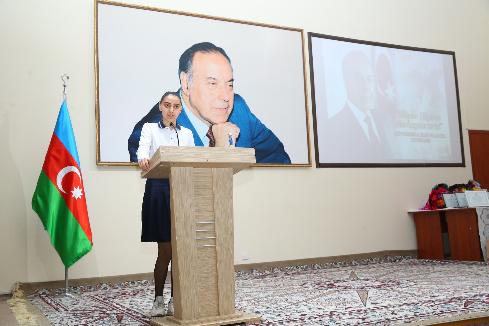 Daha sonra çıxış edən Bakı Şəhəri üzrə Təhsil İdarəsinin müdir müavini Hüseyn Əsgərov vurğuladı ki, ulu öndər Heydər Əliyevin adı və şərəfli həyatı öz Vətəninə, xalqına məhəbbətin təkrarsız təcəssümü, millətə və dövlətə xidmətin misilsiz nümunəsi kimi əsrlər boyu yaşayacaq, Azərbaycanın indiki və gələcək nəsilləri üçün əbədi örnək olacaqdır. Dahi şəxsiyyət canından çox sevdiyi xalqına möhkəm dövlətçilik təsisatlarına malik, demokratik və bəşəri dəyərlərə sadiq, dünya birliyində layiqli yer tutan müasir müstəqil Azərbaycan bəxş etdi. XX-XXI əsrlərin qovuşuğunda Azərbaycanın demokratik və bəşəri dəyərlərə sadiq, müstəqil bir dövlət kimi formalaşması Ulu Öndərimizin böyük siyasi fəaliyyətinin nəticəsidir.