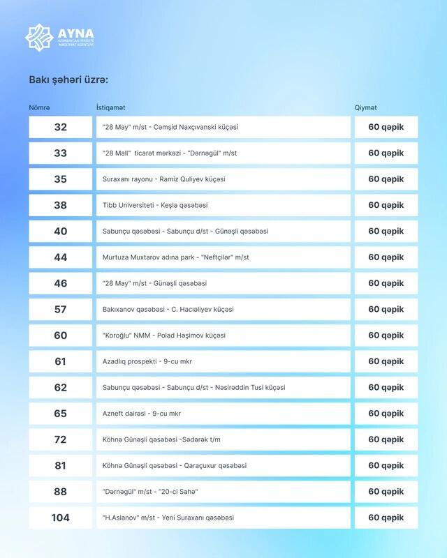 Bu avtobuslar da 60 qəpik oldu - YENİ SİYAHI
