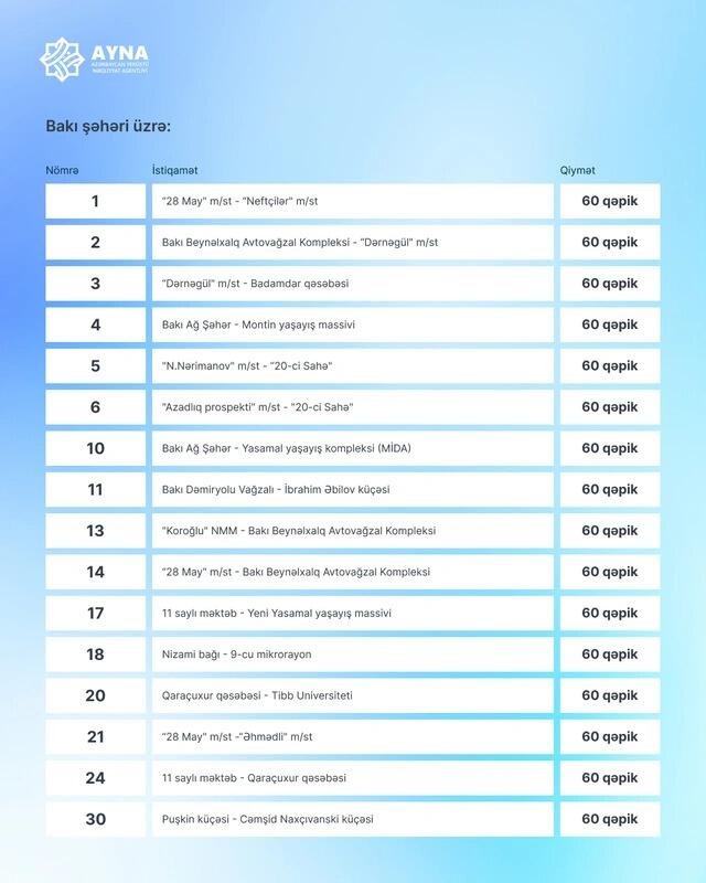 Qeyd edək ki, sentyabrın 29-da Rəqəmsal İnkişaf və Nəqliyyat Nazirliyinin Kollegiyası avtobus marşrutları və metroda sərnişindaşıma üzrə yeni tariflər müəyyən edib. Qərara əsasən, müasir tələblərə cavab verən və yalnız nağdsız ödəniş alətləri vasitəsilə fəaliyyət göstərən müntəzəm şəhərdaxili (rayondaxili), qəsəbələrarası və şəhərətrafı avtobus marşrutlarında sərnişindaşıma xidmətlərinin tariflərinin aşağı həddi (məsafədən asılı olaraq tariflər dəyişir) də 60 qəpik olaraq müəyyən edilib. Qərar oktyabrın 1-dən qüvvəyə minib.