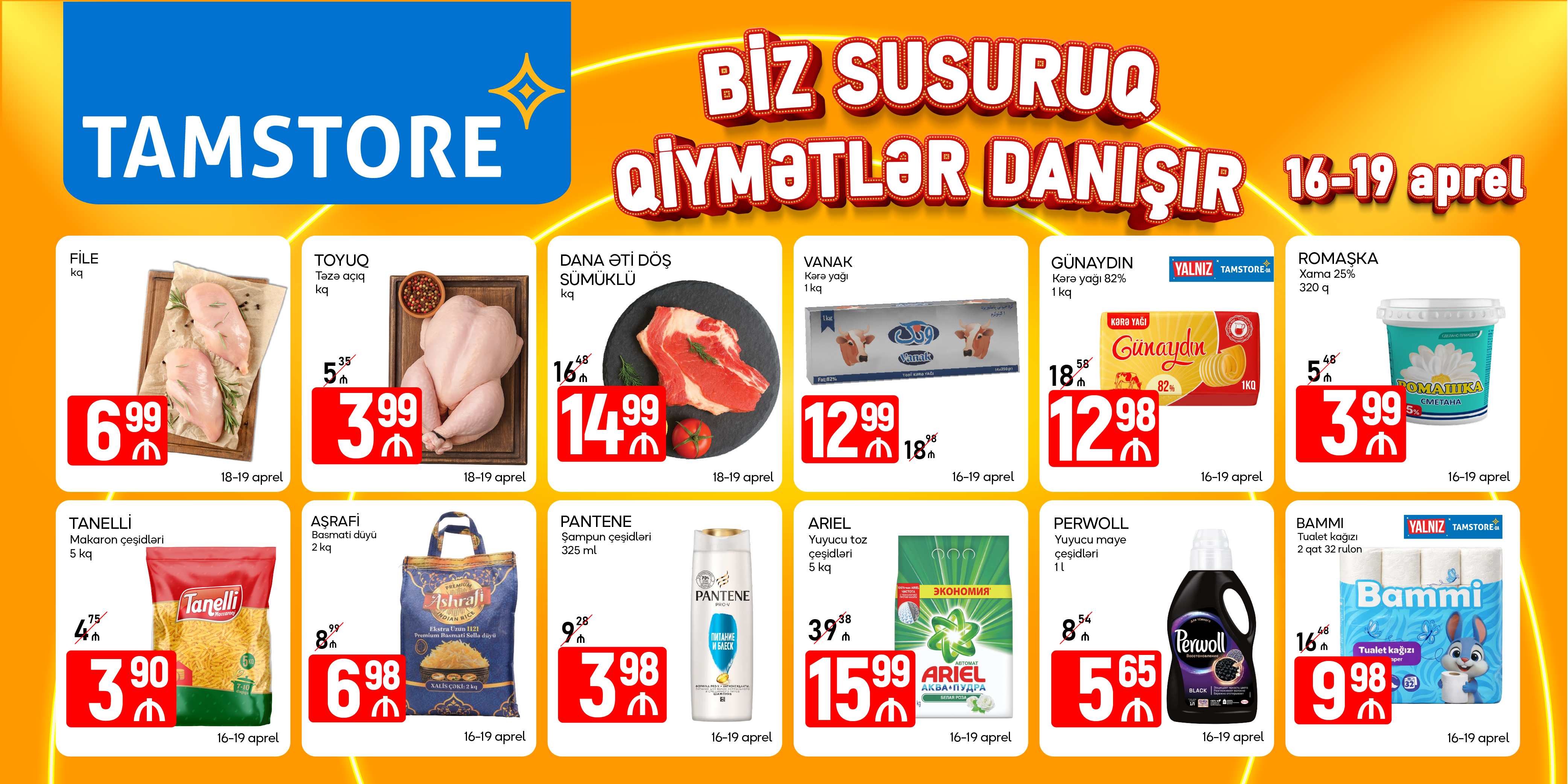 Kampaniya zamanı Vanak və Günaydın kərə yağları 12.99 manata, Romaşka xama 25 % 320 qramlıq 3.99 manata, 5 kilolouq Tanelli makaronu 3.90 manata, Əşrəfi basmati düyü kisə 2 kq 6.98 manata, Bammi tualet kağızı 32 rulon 9.99 manata, Pervol yuyucu maye 1 l 5.65 manata, Ariel yuyucu toz 5 kq 15.99 manata təklif olunacaq. Bundan başqa 18-19 aprel tarixlərində təzə toyuğun 1 kilosu 3.99 manat və sümüklü dana döş ətinin 1 kilosu 14.99 manat olacaq.