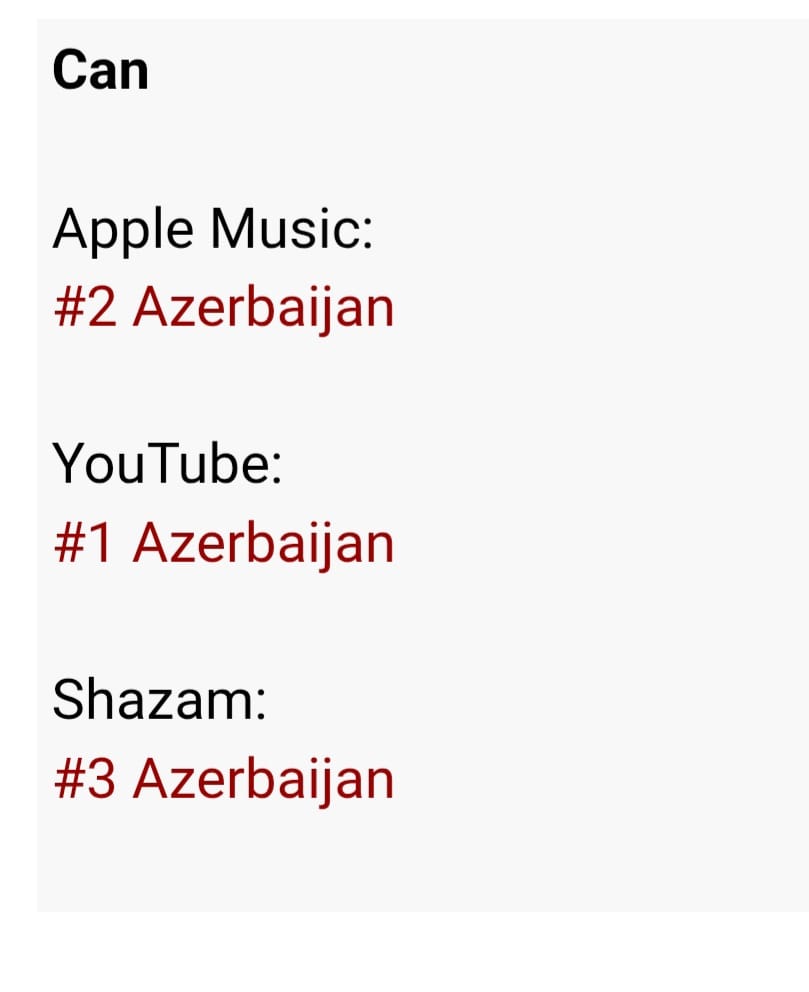 AZXEBER.COM xəbər verir ki, mahnı "Apple Music"də 2-ci, "YouTube"da 1-ci, "Shazam" siyahısında isə 3-cü yerdə qərarlaşıb.