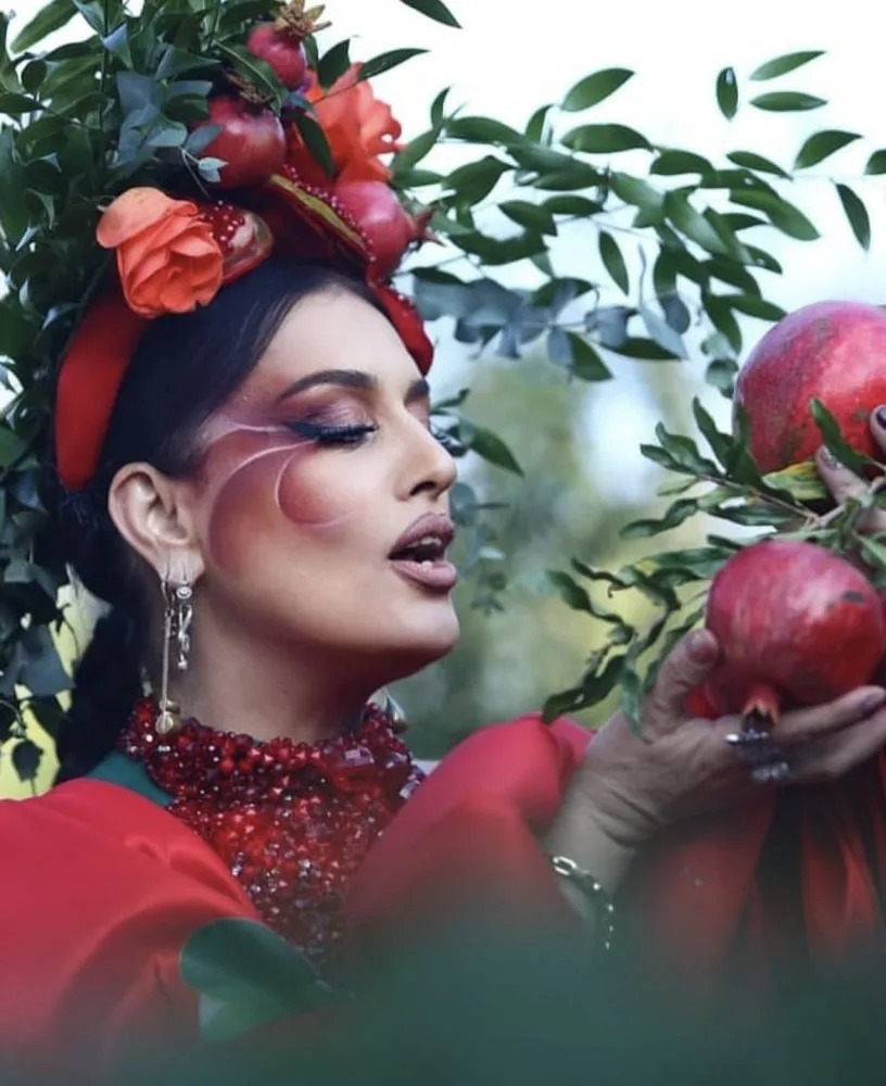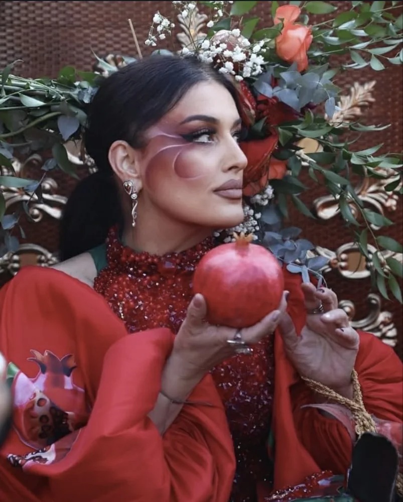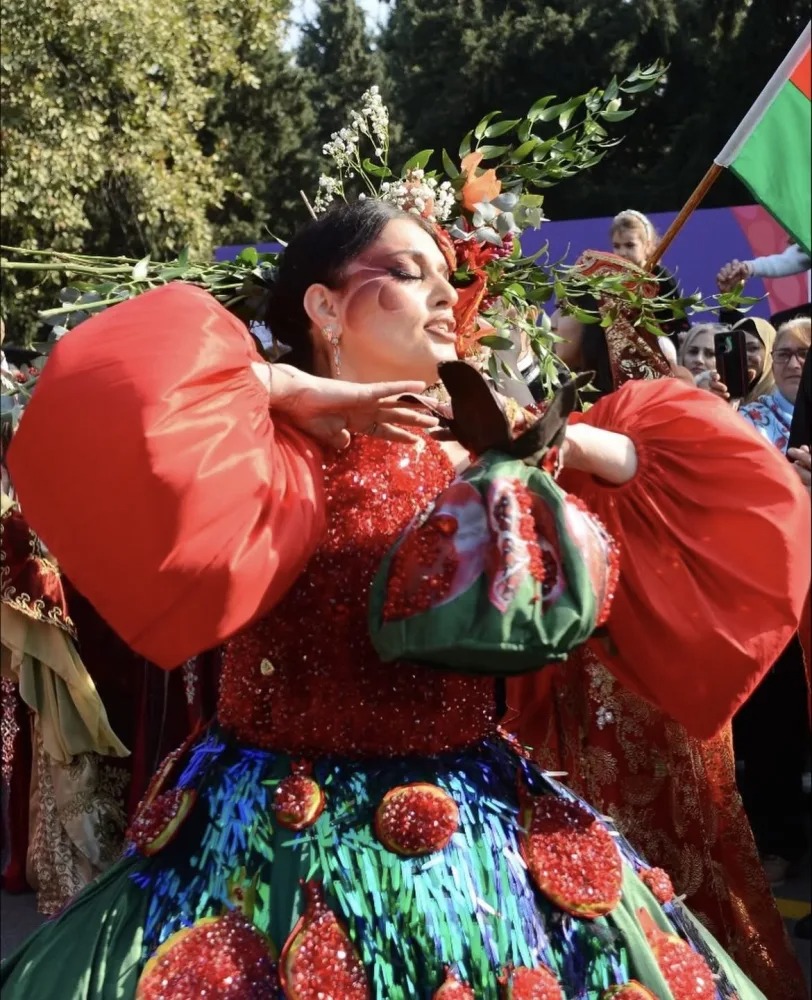 AZXEBER.COM xəbər verir ki, Göyçayda keçirilən Nar Festivalına qatılan sənətçi tədbirdə xüsusi hazırlanmış nar və bayraq üslubunda geyim və obrazı ilə səhnəyə çıxaraq tamaşaçıların marağına səbəb olub.