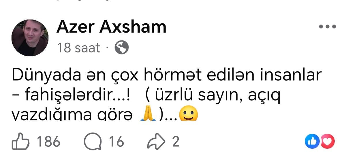 "Dünyada ən çox hörmət edilən insanlar - fahişələrdir! Üzrlü sayın, açıq yazdığıma görə…”.