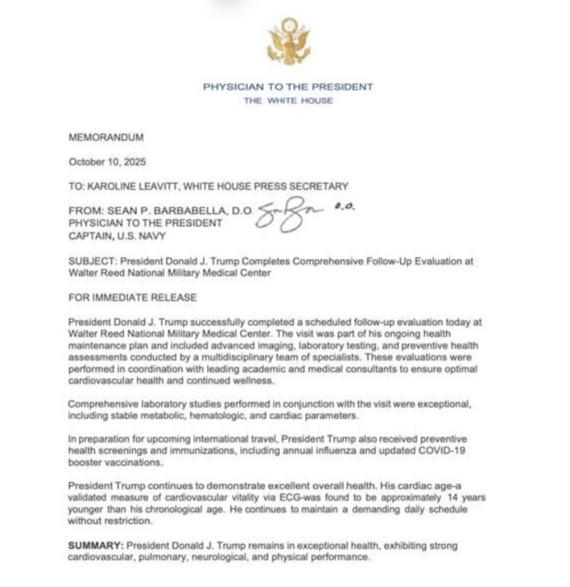 Daha sonra Donald Trampın tam tibbi müayinəsinin nəticələrini əks etdirən sənəd dərc olunub. Hesabatda ABŞ prezidentinin həkimi qeyd edib ki, tibbi parametrlərə əsasən, onun ürək-damar sağlamlığı faktiki yaşından 14 yaş kiçik bir insanın sağlamlığına uyğundur. O vurğulayıb ki, prezident gərgin gündəlik iş qrafikini davam etdirir və fiziki fəaliyyətlə bağlı heç bir məhdudiyyəti yoxdur.