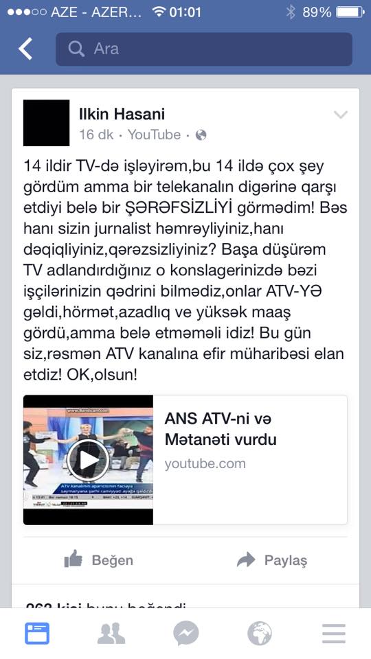Həmin statusu olduğu kimi təqdim edirik: "14 ildir TV-də işləyirəm,bu 14 ildə çox şey gördüm amma bir telekanalın digərinə qarşı etdiyi belə bir ŞƏRƏFSİZLİYİ görmədim! Bəs hanı sizin jurnalist həmrəyliyiniz,hanı dəqiqliyiniz,qərəzsizliyiniz? Başa düşürəm TV adlandırdığınız o konslagerinizdə bəzi işçilərinizin qədrini bilmədiz,onlar ATV-YƏ gəldi,hörmət,azadlıq ve yüksək maaş gördü,amma belə etməməli idiz! Bu gün siz,rəsmən ATV kanalına efir müharibəsi elan etdiz! OK,olsun!"