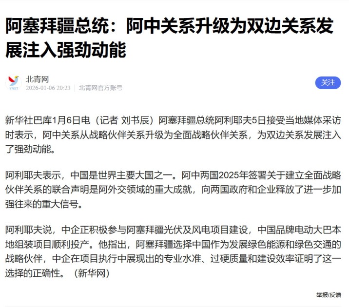 Sinxua Prezident İlham Əliyevin "Biz təkcə yaşıl energetikanı deyil, həm də yaşıl nəqliyyatı inkişaf etdirmək qərarına gəldikdə, gündəmdə strateji tərəfdaş seçmək məsələsi dayandı və Çin şirkətlərini seçdik” sitatını da xəbərə daxil edib.