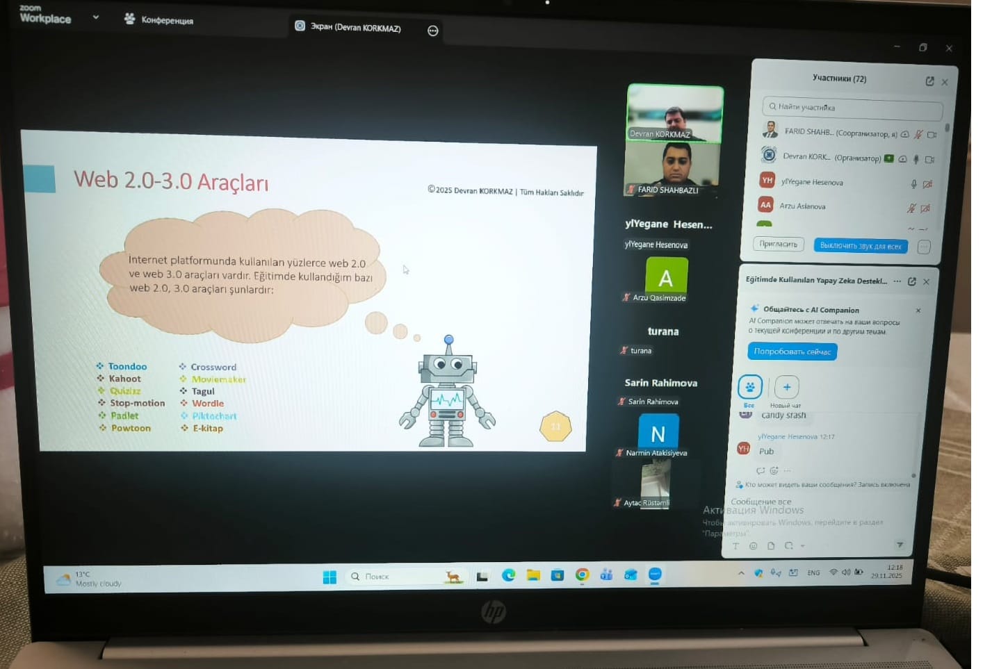 Təlimlər "Təhsil psixologiyası və şagird motivasiyası”, "Təhsil prosesində qiymətləndirmənin yeni yanaşmaları”, "Effektiv dərs planlaşdırılması və vaxtın idarə edilməsi”, "Təhsildə tətbiq olunan süni intellekt dəstəkli texnoloji materiallar” mövzularını əhatə edib. Sessiyalar İstanbul Aydın Universitetinin təcrübəli müəllimləri — Vildan Saruhan, Sözer Kırca, Buket Karadağ və Devran Korkmaz tərəfindən aparılıb.