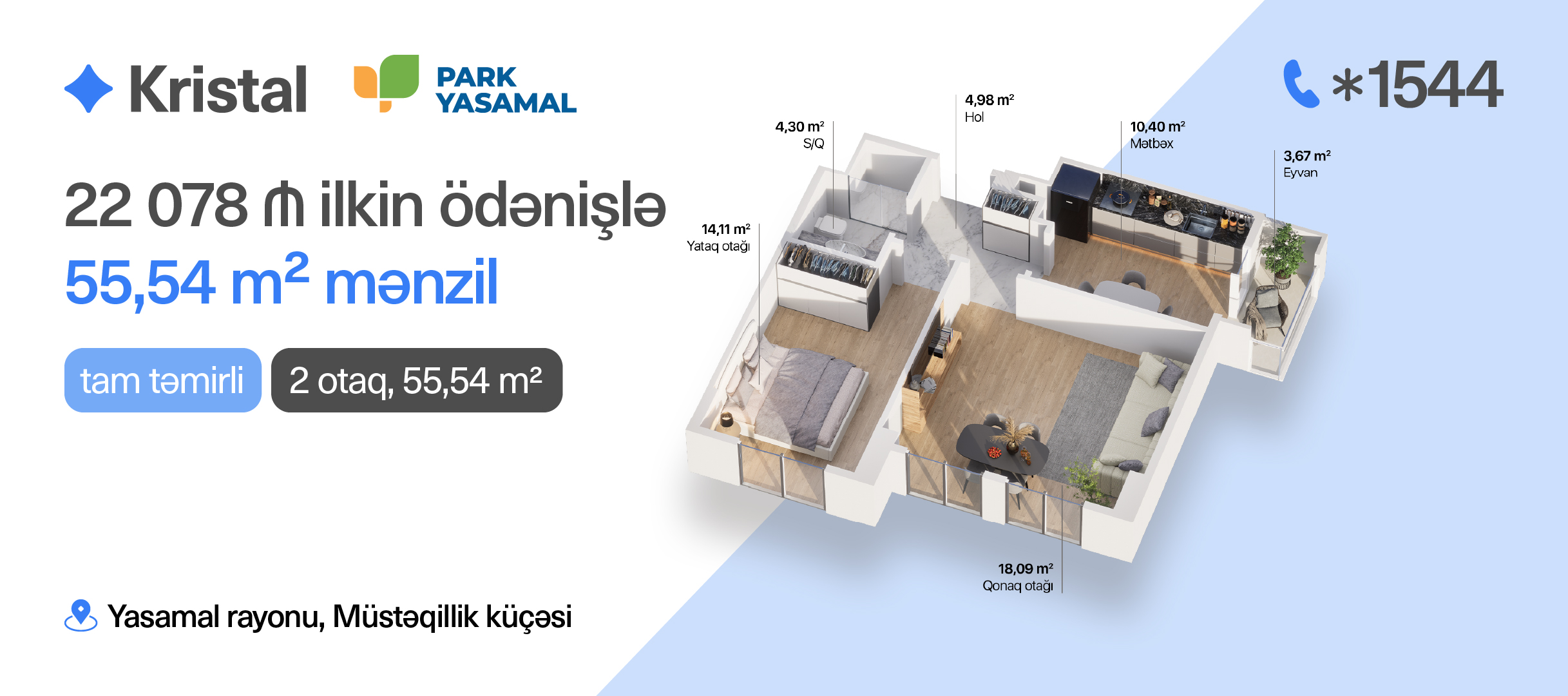 “Kristal”ın “Park Yasamal” layihəsində 18 165 manat ilkin ödənişlə tam təmirli mənzillər satılır!