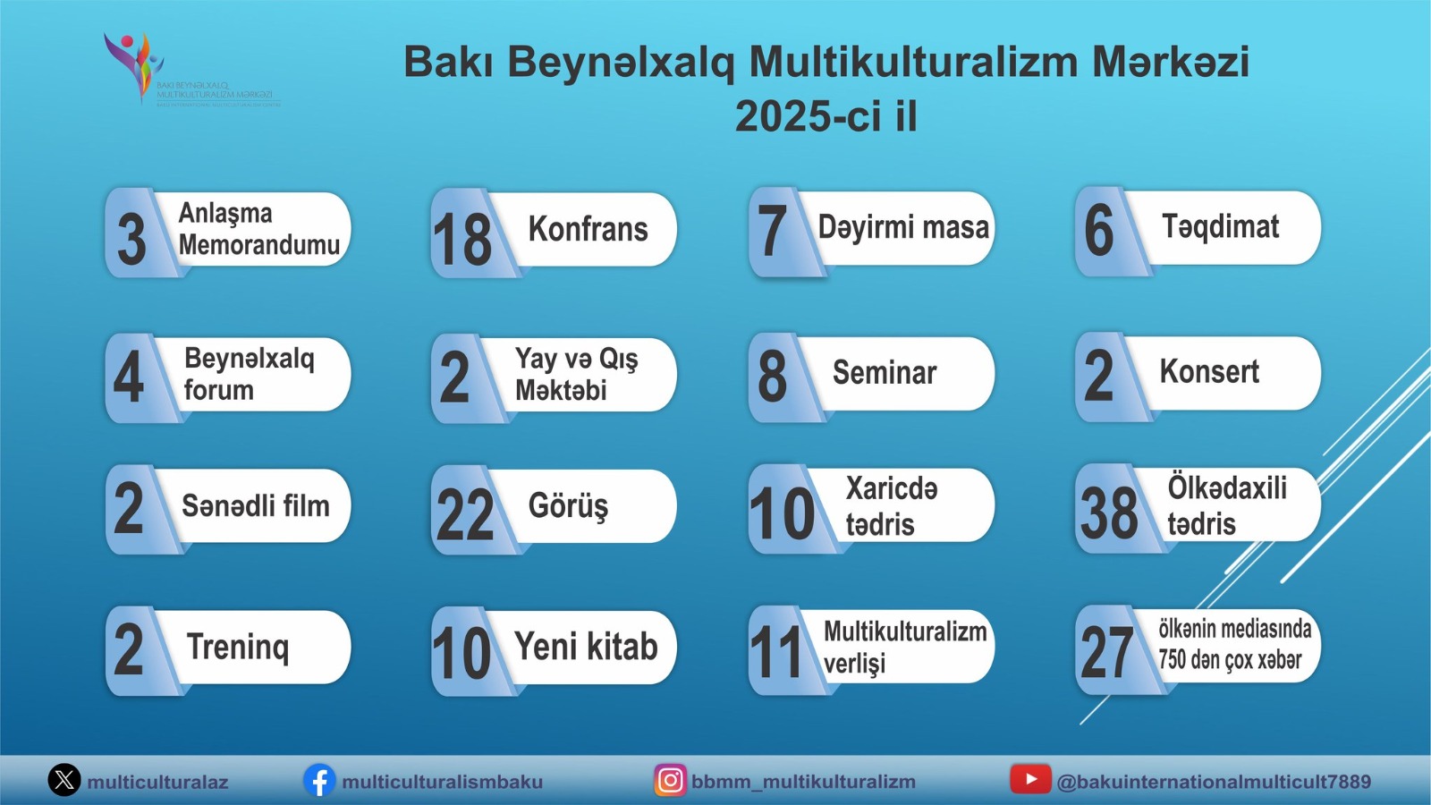 Bakı Beynəlxalq Multikulturalizm Mərkəzi (BBMM) 2025-ci ildə həm yerli, həm də beynəlxalq müstəvidə intensiv və çoxşaxəli fəaliyyət göstərib. Mərkəz il ərzində multikulturalizmin təbliği, islamofobiya və antisemitizmlə mübarizə, dağıdılmış mədəni irsin qorunması və bərpası, Qərbi azərbaycanlıların qayıdış hüququnun gündəmdə saxlanılması, eləcə də neokolonyalizmə qarşı mübarizə istiqamətlərində ardıcıl layihələr reallaşdırıb və nüfuzlu beynəlxalq platformalarda Azərbaycanın multikulturalizm modelini təqdim edib.