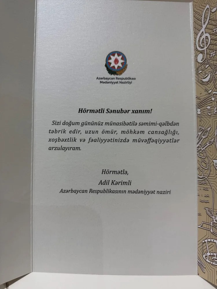 "Azərbaycan Respublikasının Mədəniyyət naziri cənab Adi Kərimliyə göstərdiyi diqqət üçün təşəkkür edirəm”, - deyə, sənətçi bildirib.