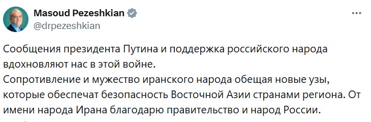 "Prezident Putinin mesajları və Rusiya xalqının dəstəyi bu müharibədə bizi ruhlandırır. İran xalqının müqaviməti və cəsarəti Şərqi Asiya və region ölkələri üçün təhlükəsizliyi təmin edəcək yeni əlaqələr vəd edir. İran xalqı adından Rusiya hökumətinə və xalqına təşəkkür edirəm", - deyə paylaşımda vurğulanıb.