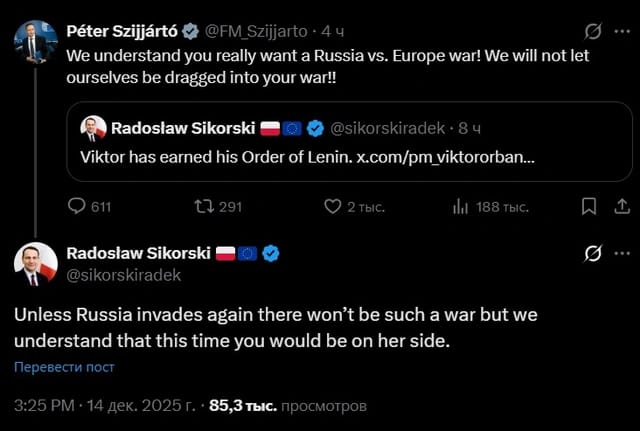 Polşa və Macarıstan xarici işlər nazirləri Radoslav Sikorski və Peter Siyarto dondurulmuş Rusiya aktivlərinin müsadirə edilməsi ilə bağlı sosial mediada mübahisə ediblər.