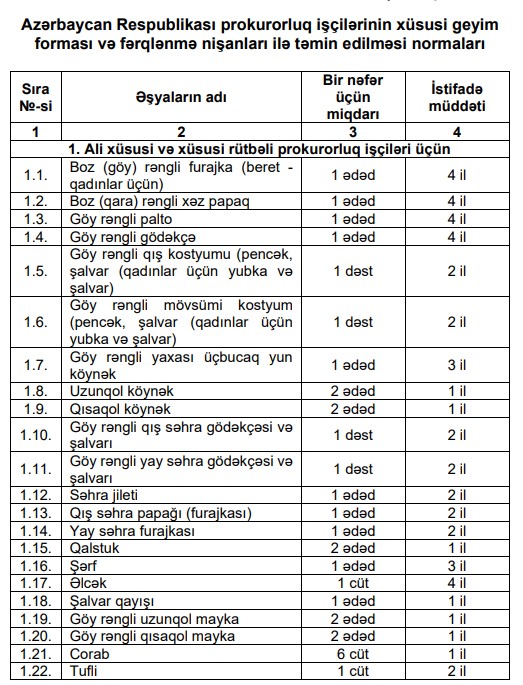 Azərbaycanda prokurorluq işçilərinin xüsusi geyim forması və fərqlənmə nişanları ilə təmin edilməsi normaları təsdiq edilib.