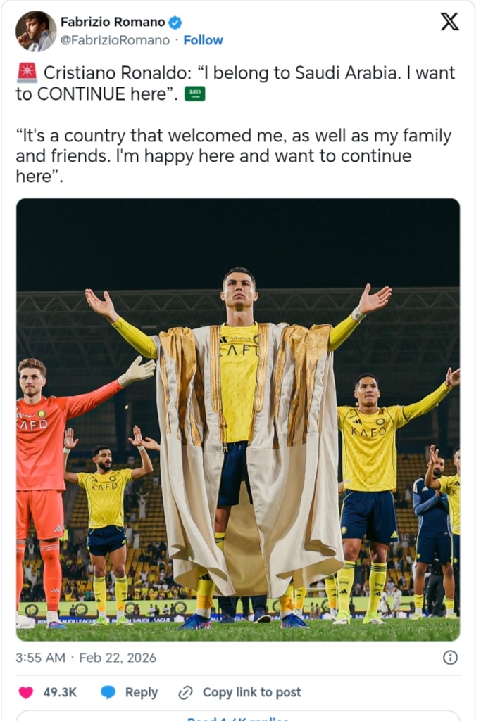 "Hazırda mən Səudiyyə Ərəbistanına aidəm. Bu ölkədə çıxış etməyə davam etmək istəyirəm. O məni, ailəmi və dostlarımı qəbul etdi. Burada olduğum üçün xoşbəxtəm və qalmaq istəyirəm!", - deyə Ronaldu vurğulayıb.