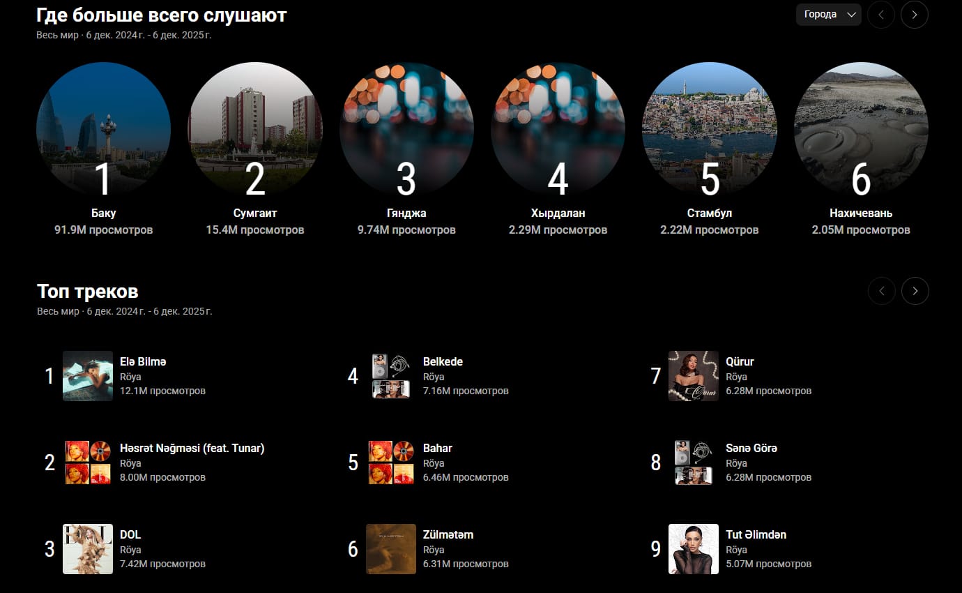 Xalq artisti Röya Ayxan 2025-ci ildə YouTube-un Azərbaycanda ən çox dinlənilən ifaçısı seçilib.
