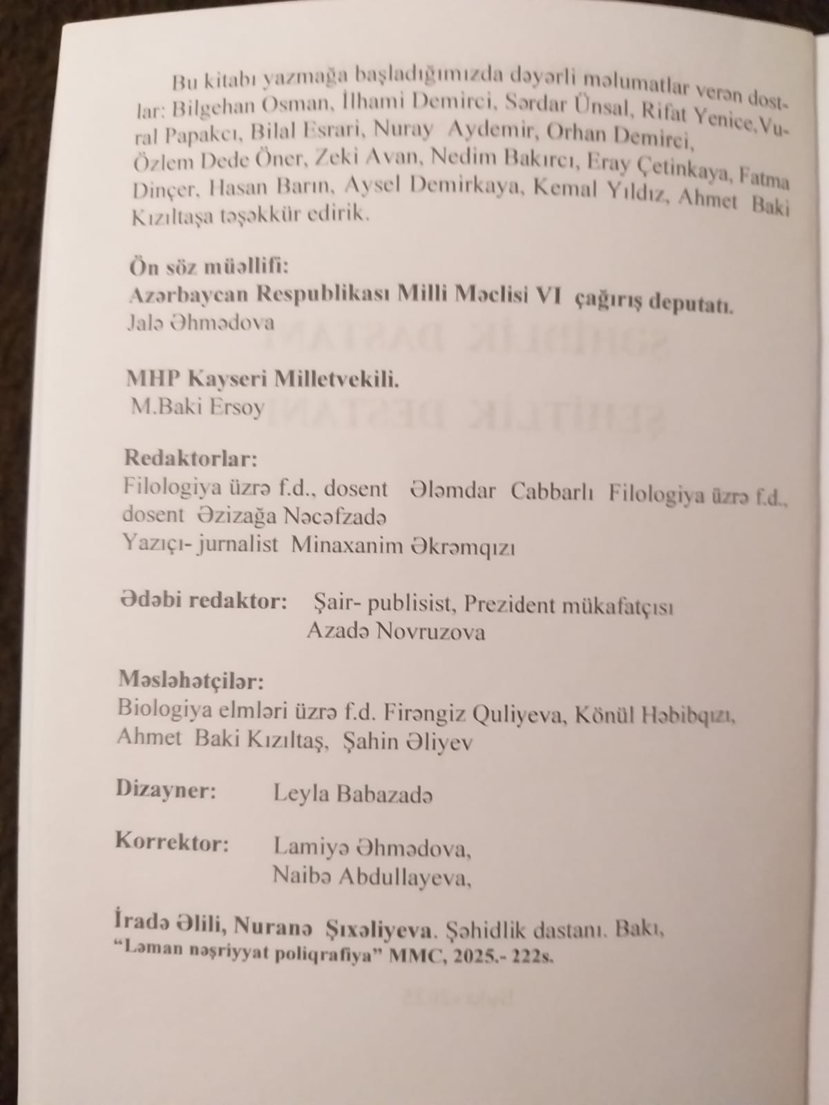 Müəlliflər Nuranə Şıxaliyeva və İradə Əlili  kitab üçün  önəmli  məlumatları  çatdıran dostlara- Bilgehan Osman, İlhami Demirci, Serdar Ünsal, Rifat Yenice, Vural Papakcı, Bilal Esrari, Nuray Aydemir, Orhan Demirci, Özlem Dede Öner, Zeki Avan, Nedim Bakırcı, Eray Çetinkaya, Fatma Dinçer, Hasan Barın, Aysel Demirkaya, Kemal Yıldız, Ahmet Baki Kızıltaşa öz  təşəkkürlərini bildirirlər.