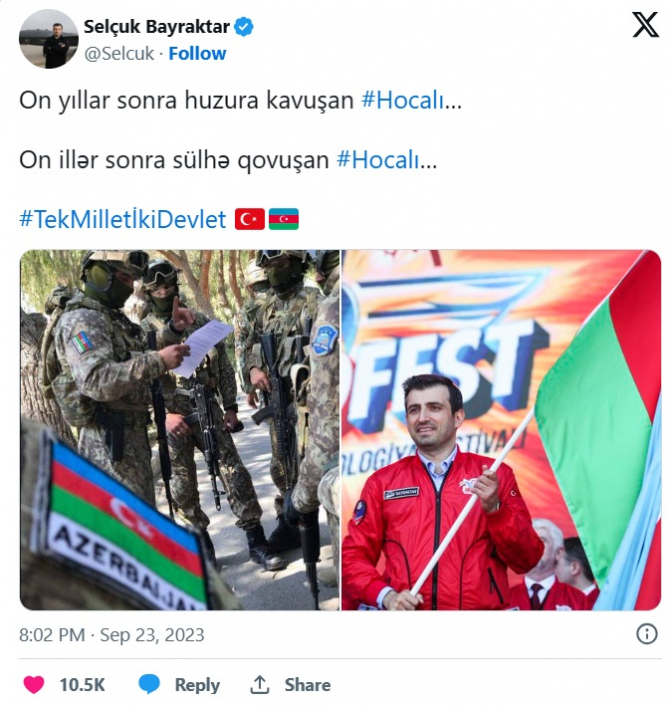 "Baykar” şirkətinin texniki direktoru Səlcuq Bayraktar "X” sosial şəbəkə hesabında Xocalı ilə bağlı paylaşım edib. O yazıb: "On illər sonra hüzura qovuşan Xocalı... On illər sonra sülhə qovuşan Xocalı...”. Paylaşımı təqdim edirik: