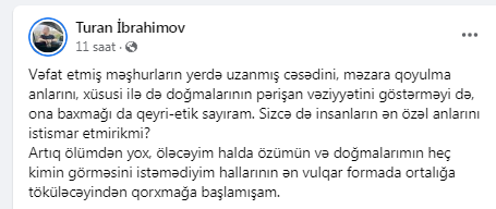 "Vəfat etmiş məşhurların yerdə uzanmış cəsədini, məzara qoyulma anlarını, xüsusi ilə də doğmalarının pərişan vəziyyətini göstərməyi də, ona baxmağı da qeyri-etik sayıram. Sizcə də insanların ən özəl anlarını istismar etmirikmi?