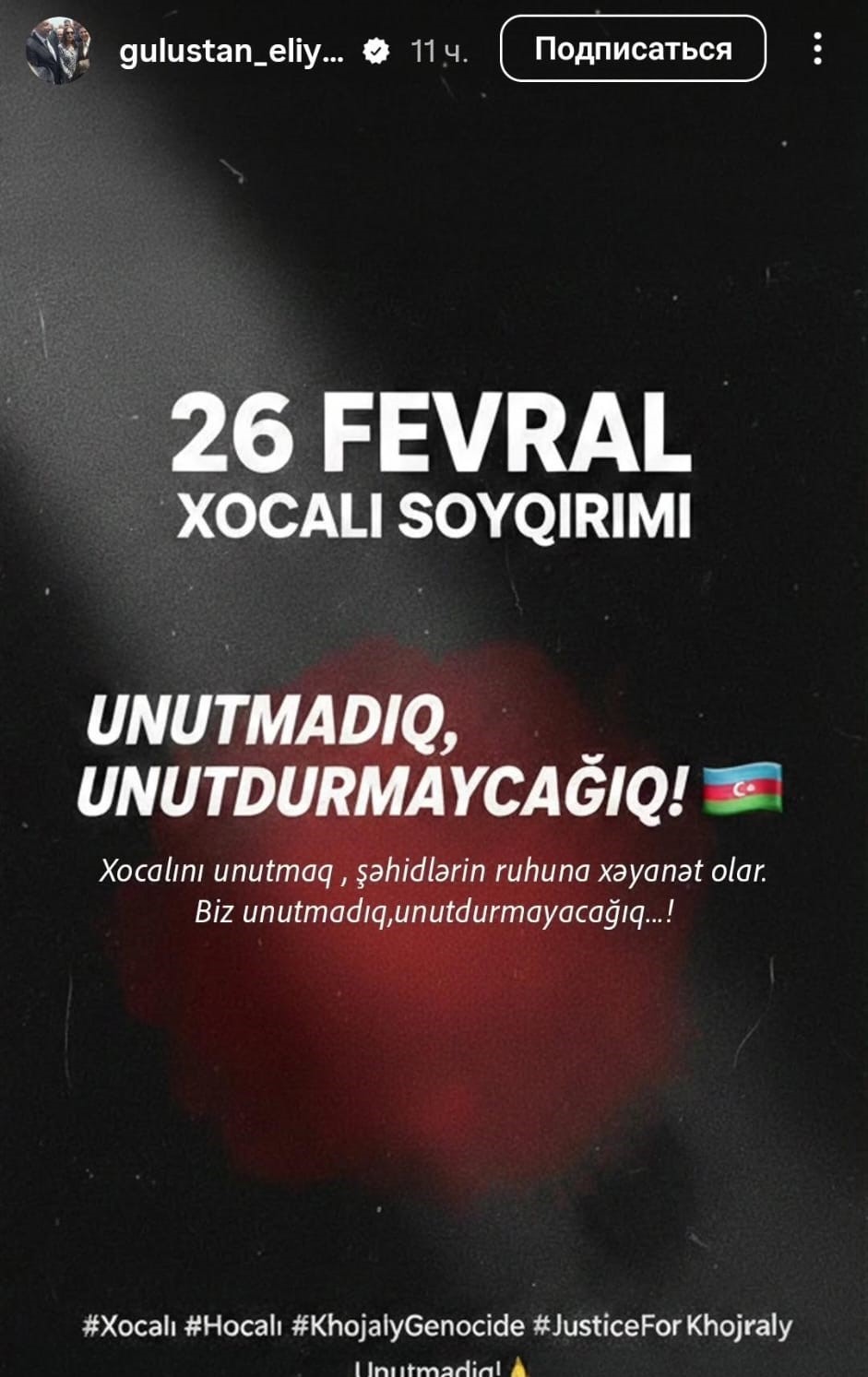 Əməkdar artist Gülüstan Əliyeva Xocalı soyqırımı ilə bağlı paylaşım edib.